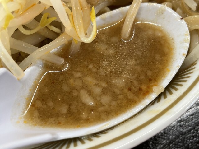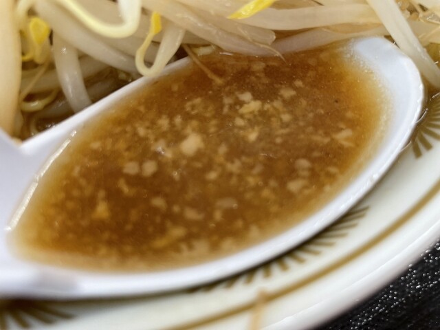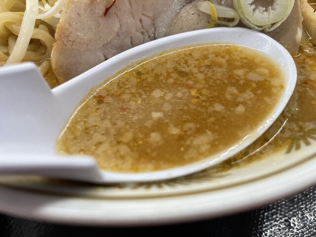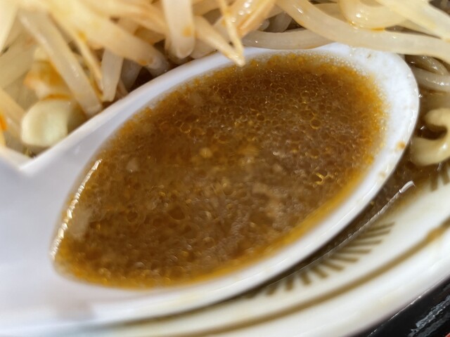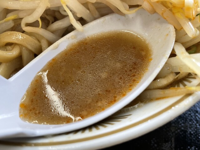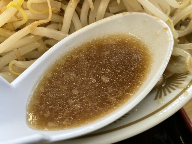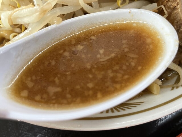 『朝食 ラーメンニンニク野菜マシマシ+メンマ』のスープ