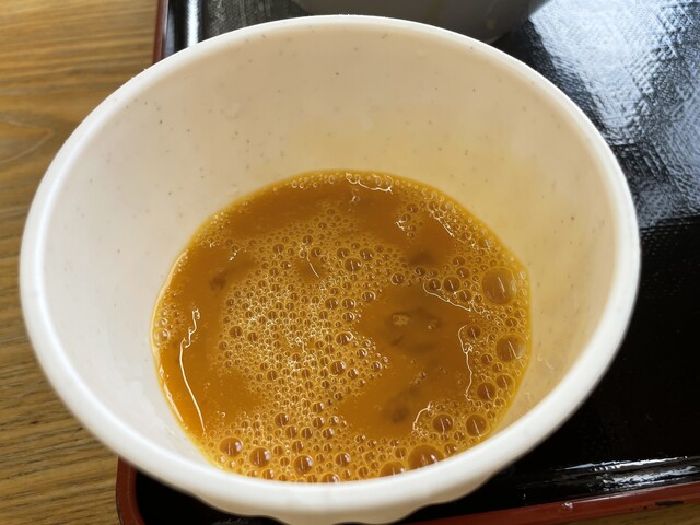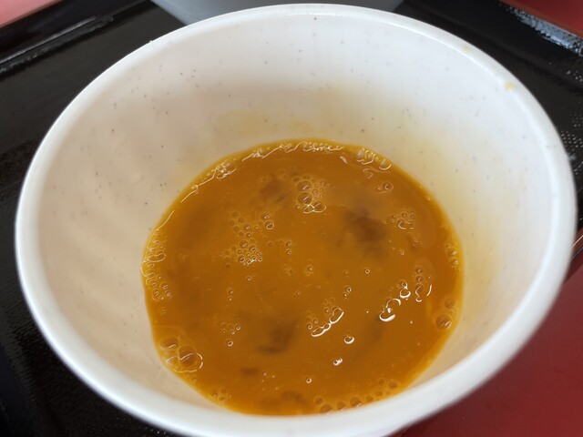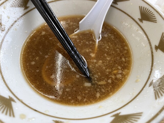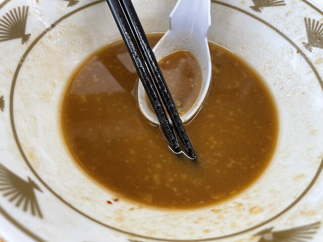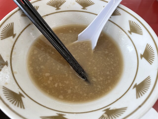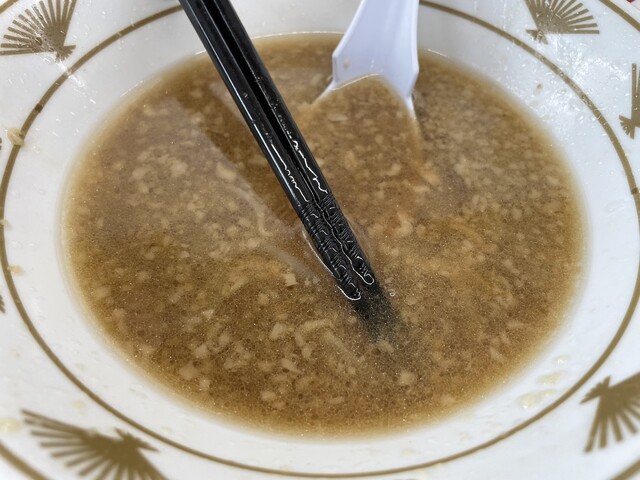 『朝食セット(ラーメンニンニク野菜マシマシ&ライス普通)+A賞特典』のスープ
