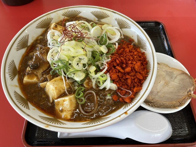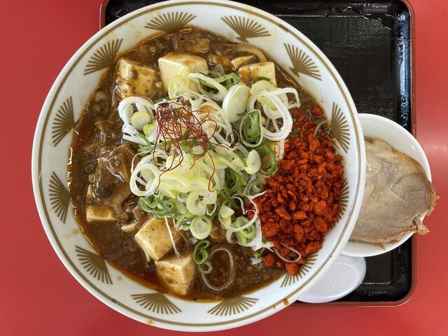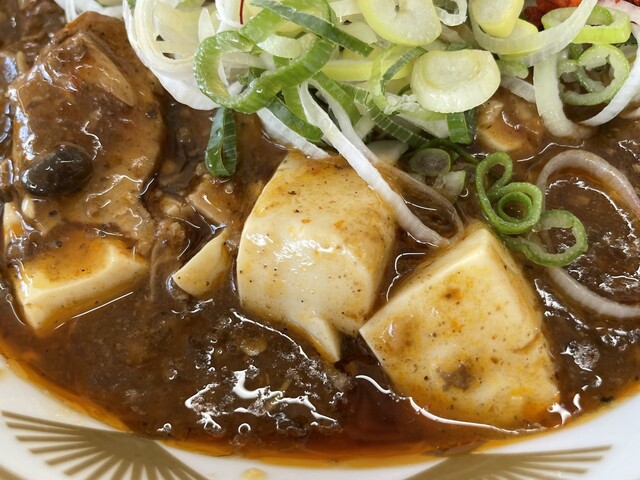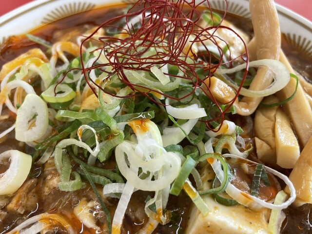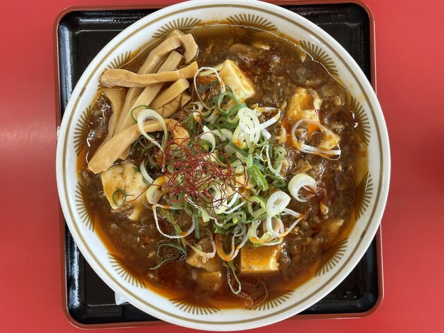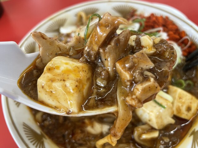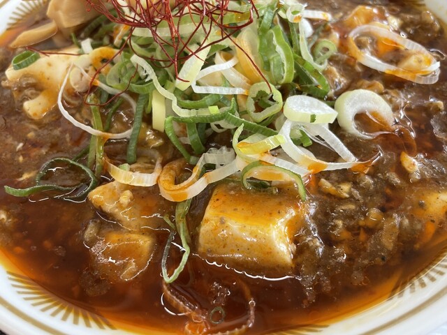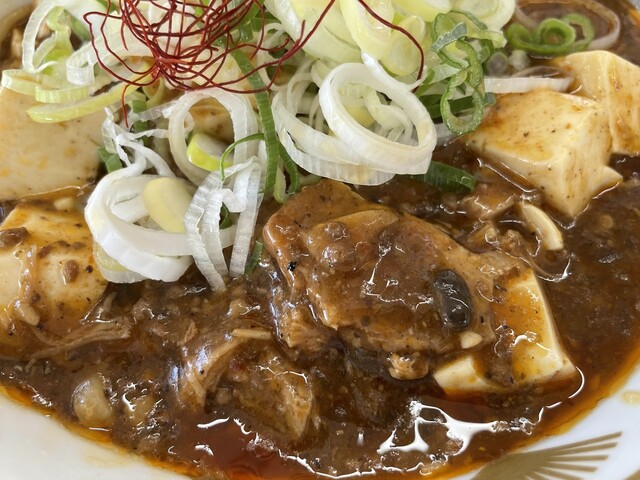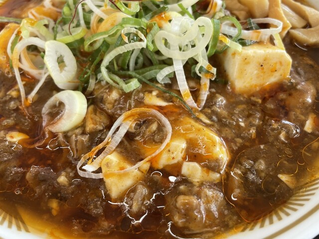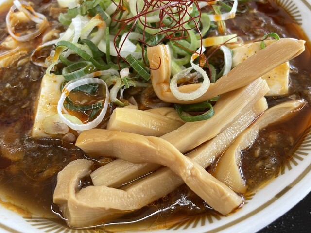 程なくして着丼、麺が見えなくなるまで盛られたたっぷりの麻婆餡とネギ、「麻婆ラーメン」には珍しいメンマのトッピングが特徴的です。