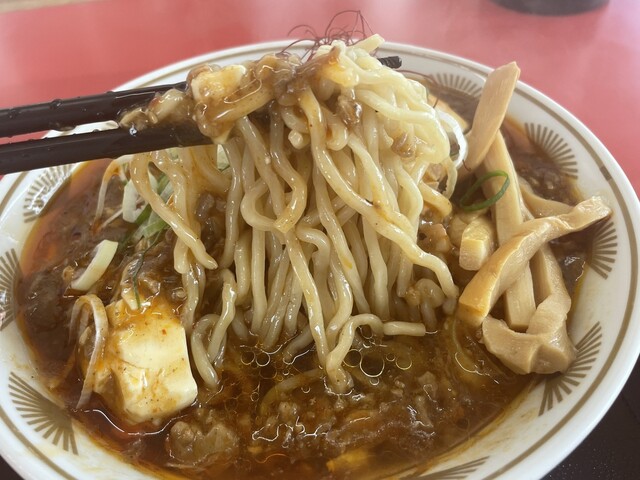 程なくして着丼、麺が見えないので「麻婆ラーメン」との見た目の違いはトッピングのメンマが辛玉に替わっているくらい、よくかき混ぜると麺は極太平緩縮れ仕様になっています。