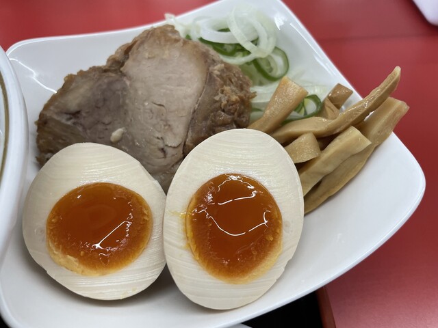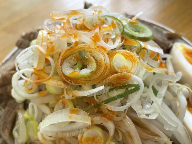 トッピングは豚4枚・味玉・野菜・ねぎ、全体をかき混ぜてトッピングをタレに絡めてからいただきます。