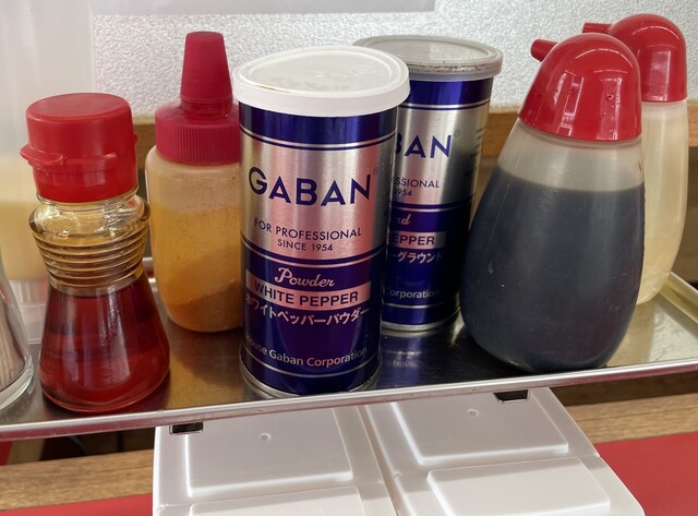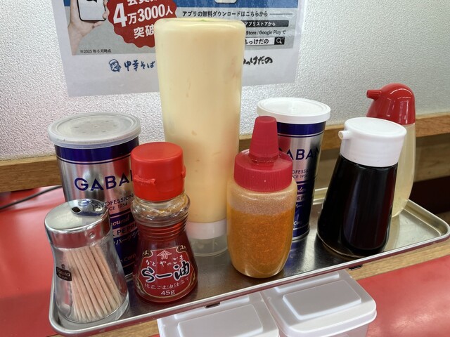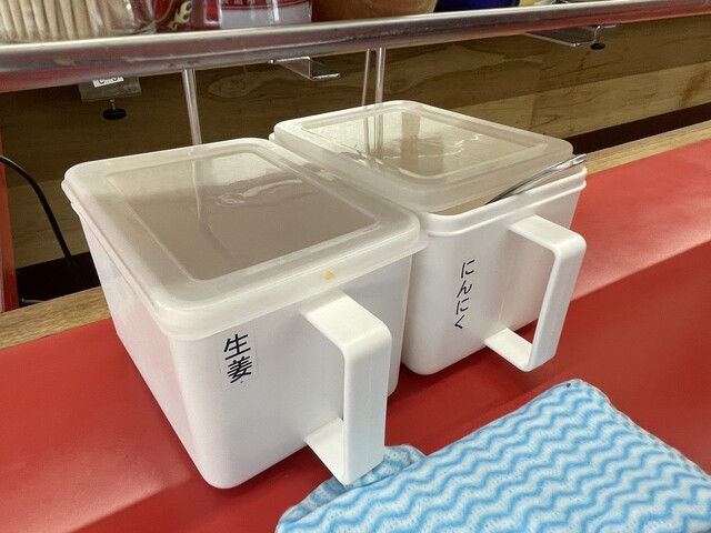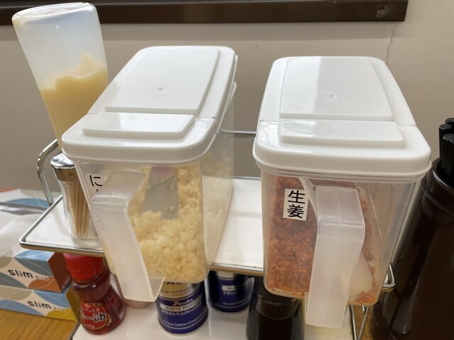 今回は「ラーメン野菜マシマシ」をオーダー、豊富な種類の卓上調味料からいつものニンニクをたっぷりトッピングしていただきました。