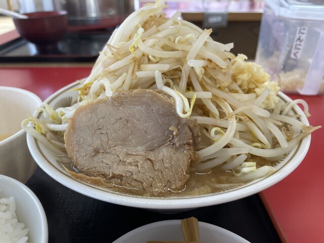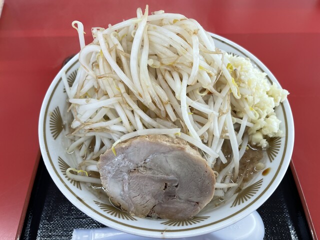 『朝食セット(ラーメンニンニク野菜マシマシ&ライス普通)+A賞特典』のラーメン