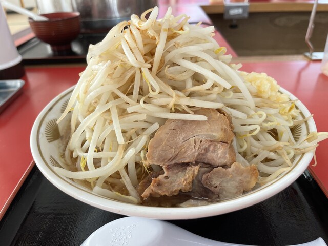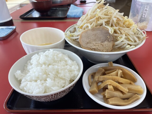 今回は「朝食セット」のラーメン野菜マシマシをオーダー、食べ放題だった「無限ライス」は9月末で終了し小盛・普通盛・大盛の「選べる3サイズ」になったとのことで、大盛でお願いしました。