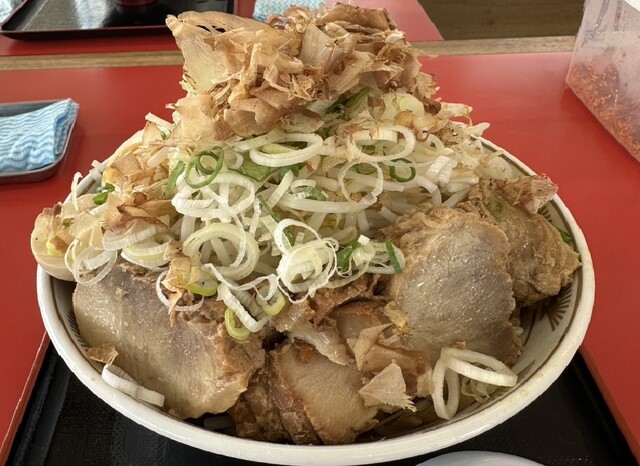 何度もお世話になっている「ラーメン もっけだの」さんに訪店、お腹いっぱい食べたい気分の今回は未食の「特製汁なし」を麺特盛野菜マシマシでオーダーし、程なくして着丼です。