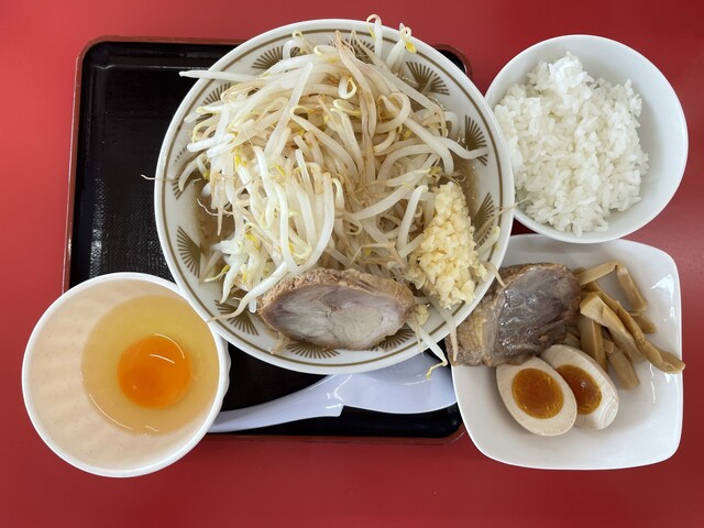 『朝食セット(ラーメンニンニク野菜マシマシ&ライス普通)+A賞特典』のTKG