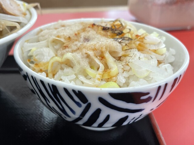 まもなく着丼、「あぶら飯」のほかに茶碗にはライスがよそうってあり「お替わりの時はお声掛けください」的なスタッフさん、セルフサービスの炊飯ジャーもなくなっていました。