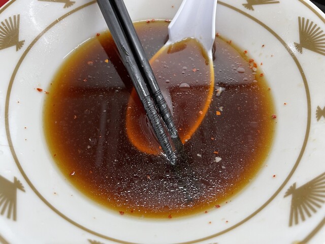まもなく着丼、「割りスープもあるので必要な時言ってください。」とのこと、外観は超シンプル、しょっぱめのつけ汁、途中で麺に一味唐辛子を振って味変しました。