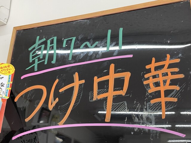 券売機の前に立って「ラーメン」にするか「朝食セット(ラーメン)」にするか迷っていると、すぐ横に「7:00-11:00旧店舗の人気メニューつけ中華復活」のポスターが貼ってあり、全店舗共通のようでした。