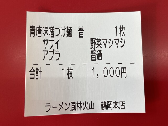 「ラーメン 風林火山」さんで約2年半ぶりに「赤唐味噌中華」の「食べるラー油をつける」をチョイス、今回は諸事情によりニンニクをトッピングしないで食べてみました。