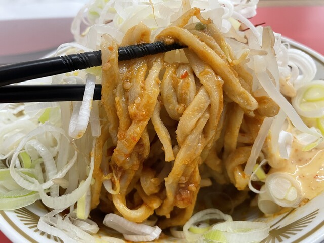 『赤唐味噌まぜそば(食べるラー油付+ネギ)』の麺