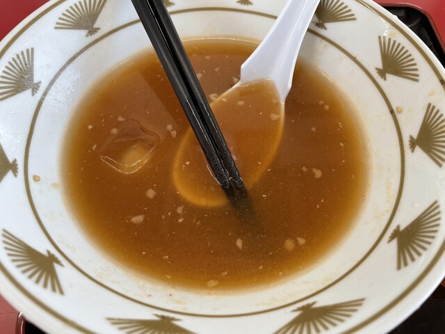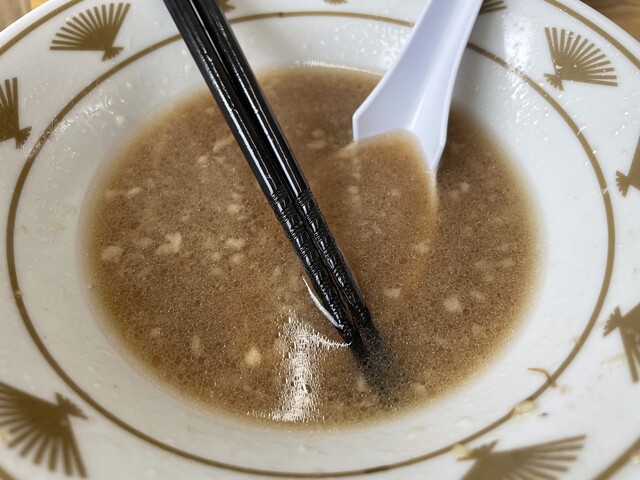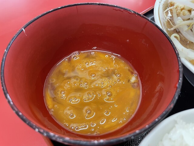 『朝食セット(ラーメン)+あぶら飯』の『ハーフラーメンニンニク野菜マシマシ』のスープ