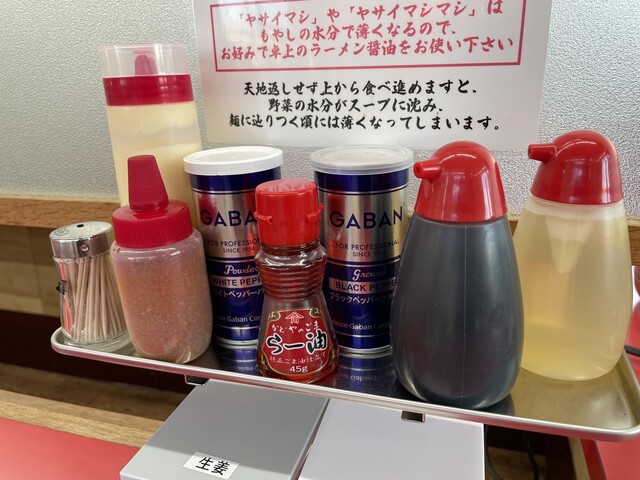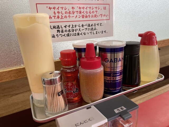 今回は「ラーメン」の野菜マシマシを券売機で購入、テーブルのニンニクと久しぶりにショウガをトッピングして味変を楽しみました。