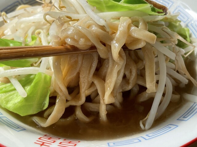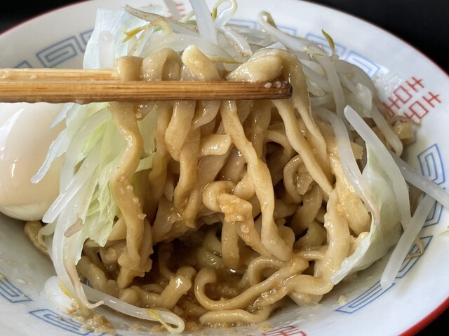 『ラーメン普通ニンニクショウガヤサイマシマシ+味玉(スクラッチクーポン)』の麺
