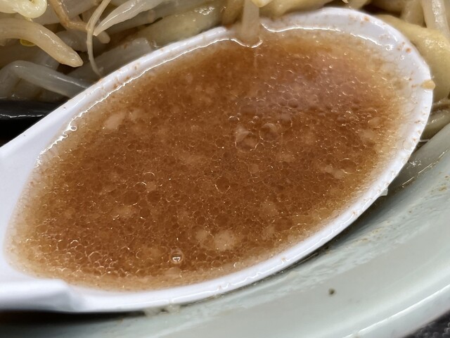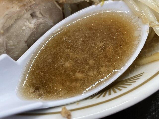 『ラーメン普通ニンニクショウガヤサイマシマシ+味玉(スクラッチクーポン)』のスープ