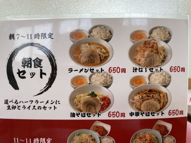 酒田店・山形店に続きようやく朝営業がスタート、4種類から選べるハーフラーメンに無限(おかわり自由)ライスと生卵が付く朝食セットも楽しみですが、朝からランチセット以外の全メニューのオーダーが可能なようなので、利用する幅が広がりありがたいです。
