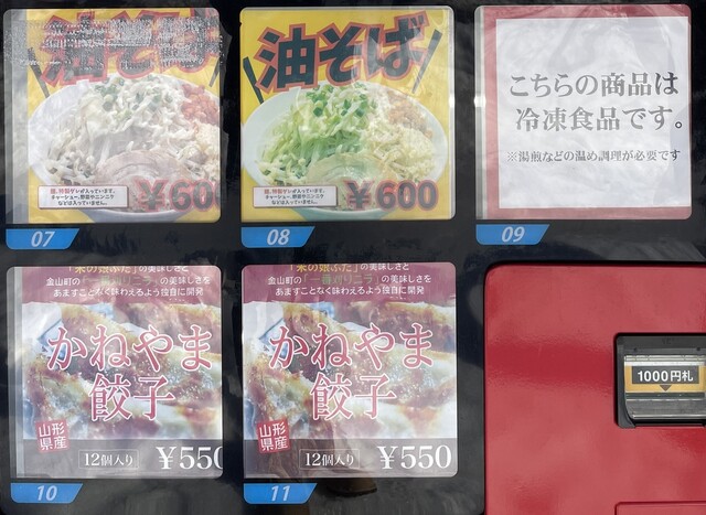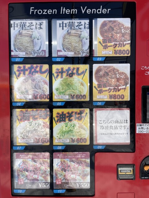 冷凍ラーメン、カレー、餃子自販機のメニュー