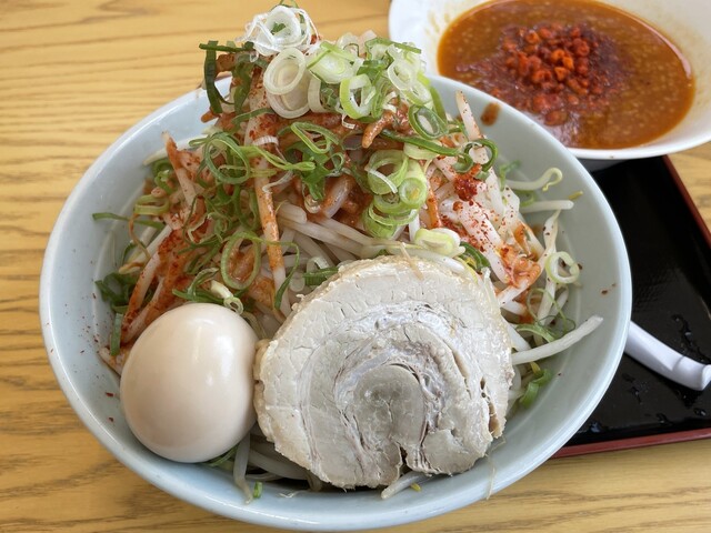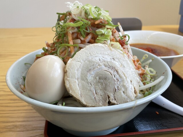 『旨辛つけ麺 炎山ニンニクヤサイマシマシ+味玉(スクラッチクーポン)』の豚