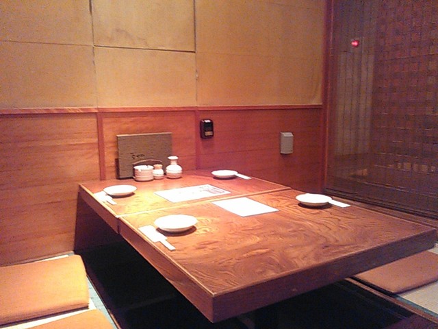 当店【旬魚 ゆるり】はB1Fに入口があり、靴箱に靴を入れて店内に入ります。訪問日は平日の早い時間だったのでお客の入りは3割程度です。ご主人には訳あり(接待的な事情)を話していたので、B2Fの半個室的なスペースに案内されました。比較的広く席をとってあるため居心地が良い場所です。