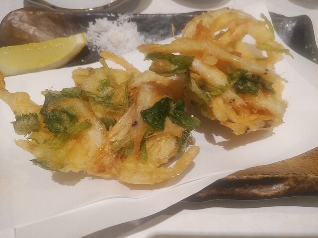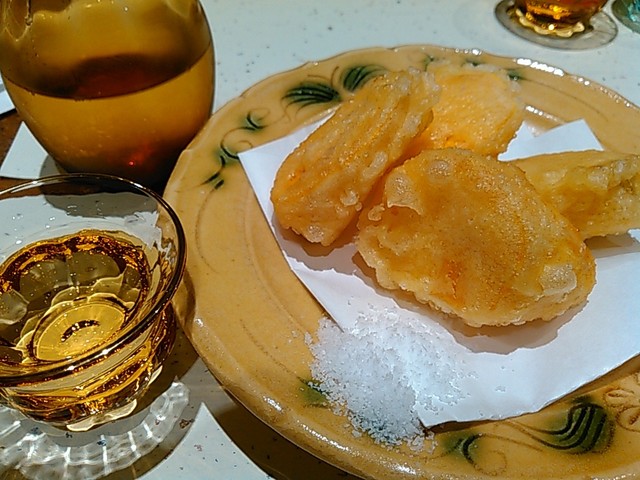 安納芋の天ぷらは想像以上に甘く、塩を振るとさらに甘く、ツレのお酒がクイクイ進んでいます。