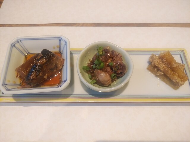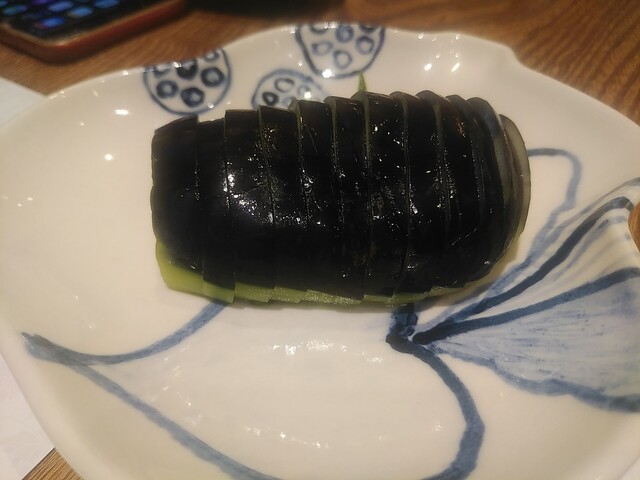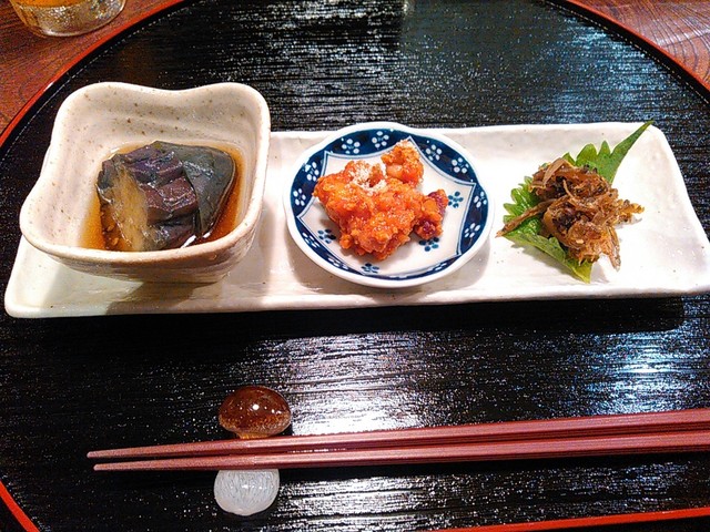 カウンター越しにご主人の様子を眺めると、とても丁寧にお仕事をされているのがわかります。最初に注文した際に、ほかのお客様との入店が重なったらしく、奥様から少し時間がかかる旨の説明をいただけたのも好印象でした。大丈夫です。写真の通りお通しがしっかりしていますから、秋茄子食べつつゆっくり待たせていただきます。