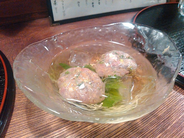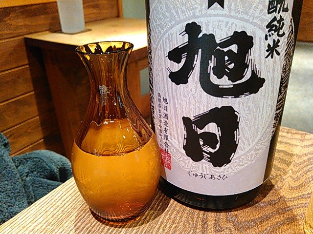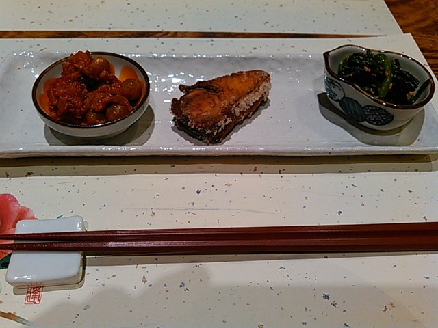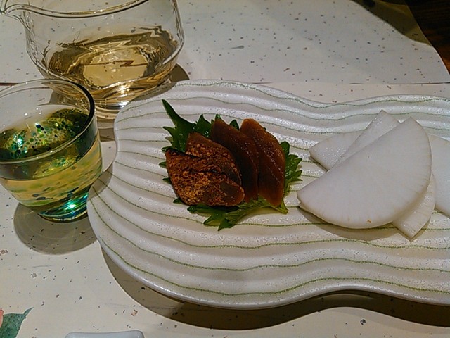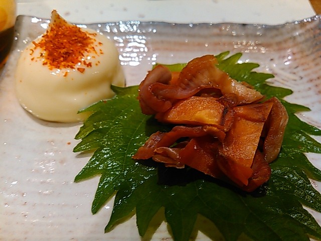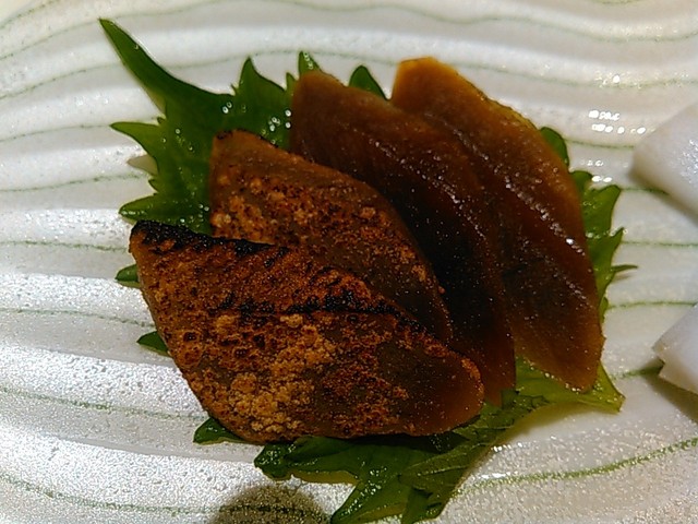 今回の日本酒は風味のあるお酒を中心に頼みました。女将さんお勧めの風の森は「ビックリしますよ」との予告の通り、強い果実のような口当たり・味わいがあって、結構酸味も強く、単純にフルーティと表現すると陳腐になってしまう深い美味しさがあります。十旭日は初めて飲みましたが、非常に直球というか丁寧な甘みと少しの渋みを感る最良質のお酒でした。個人的には難しいところですがトリッキーな風の森に軍配かな~。鷹長がマイブーム中のオイラだし。