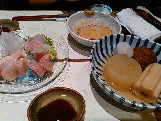でも、こんな寒い日はまずはおでんでしょう、という事で大根、里芋、ちくわぶ、しらたき、あたりをパパッと頼みます。