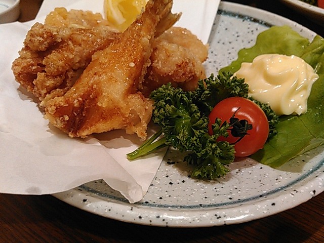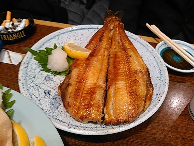 後半は、宴会向けの厨房の忙しさも一段落着いたらしく、焼き物系の注文OKも出ましたので(※禁止されたのではなく、時間がかかるとの説明があったものです)、ホッケ焼き等をツマミにチビチビ熱燗を追加でいただきます。それぞれはカマやアジフライなんてのもお好みで。メタボを気にする知人は海鮮サラダを頼んでましたが、カニばっかり食べてたら意味がないんじゃないのw