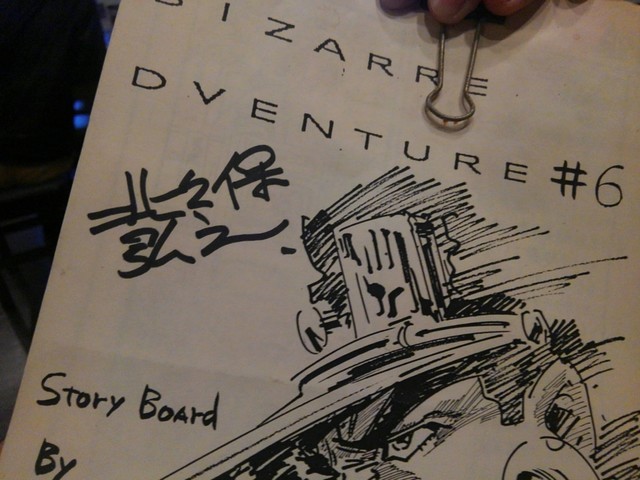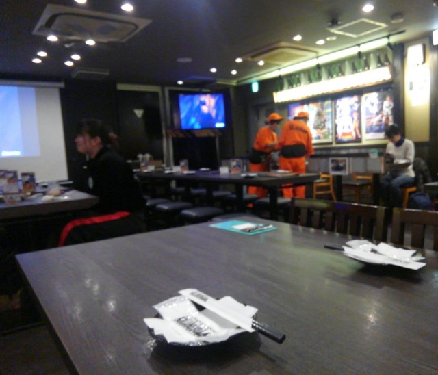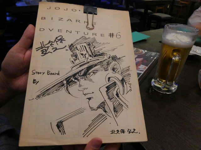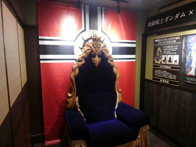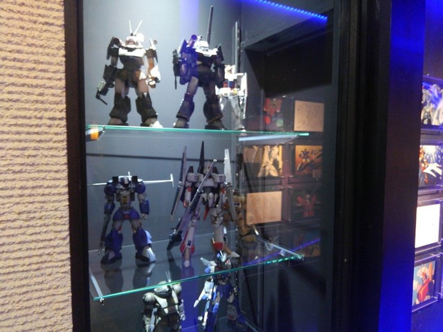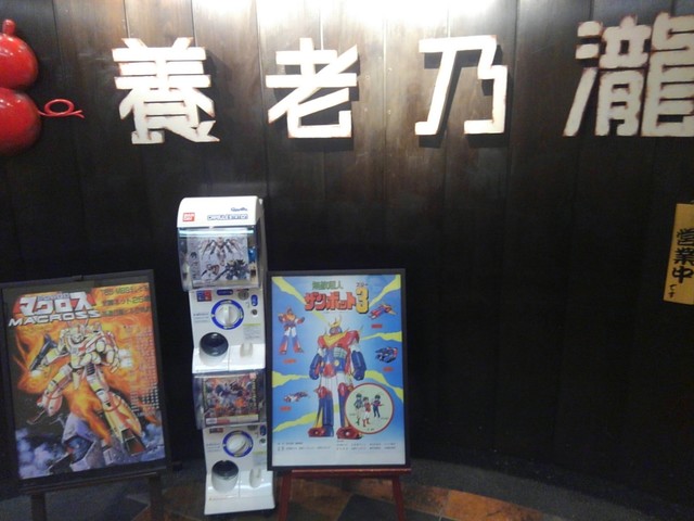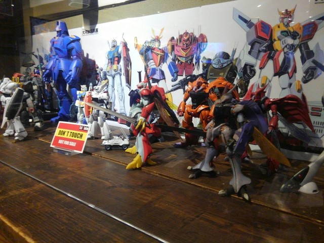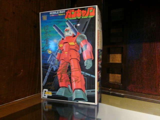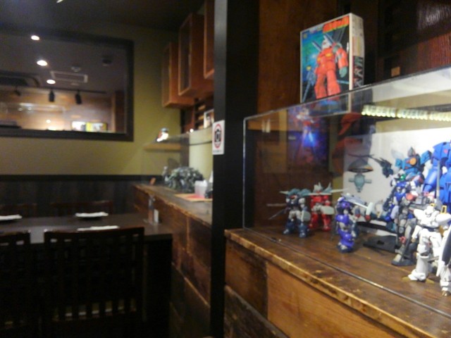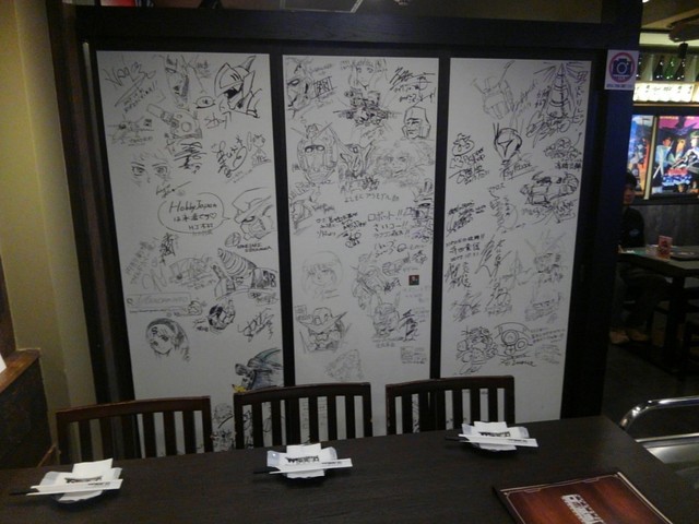 そして二つ目の違いは、やはり展示された造形物と壁に描かれたサインや絵の数々でしょう。私はその手の人名や作品に詳しくないので、全体の中ではほんの僅かしか判断できませんでしたが、それでも幾つかのサインには見覚えがあります。例えばテーブルの横にあったガンダムのモビルスーツであるガンキャノン。それに登場したカイシデン役といったら、うる星やつらの諸星あたるを演じたあのヒトです。なっつかしいな~、実家のLDまだ動くかな~、なんて思い出が溢れてきて、思わず写真に収めます。