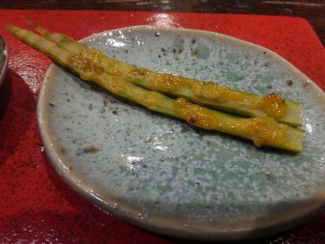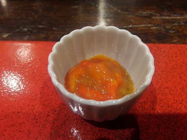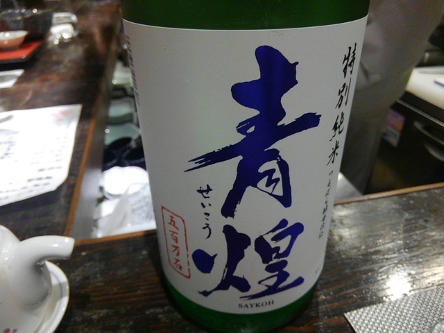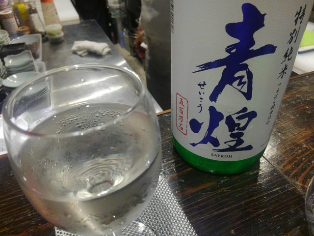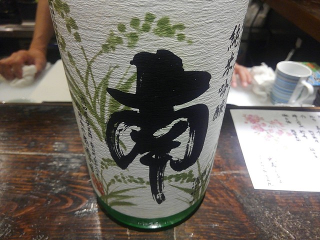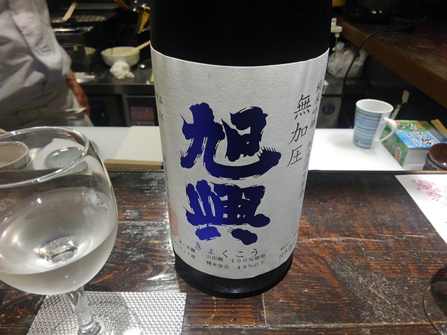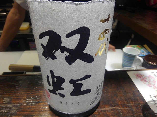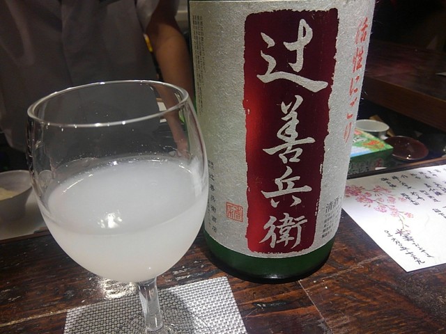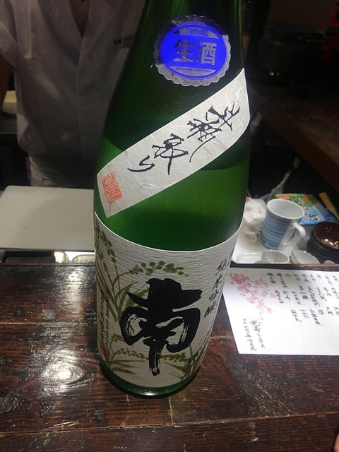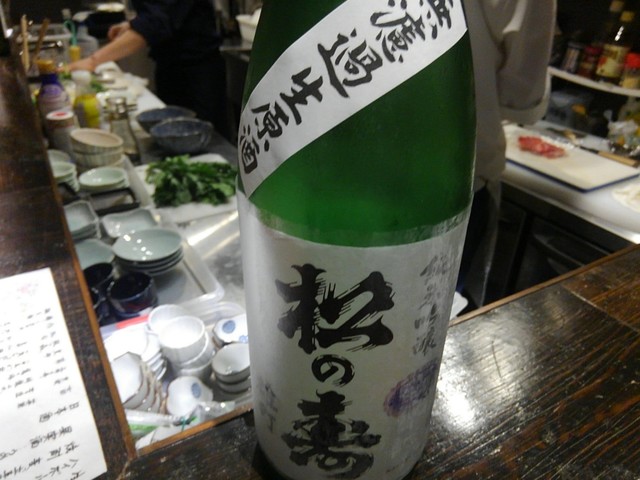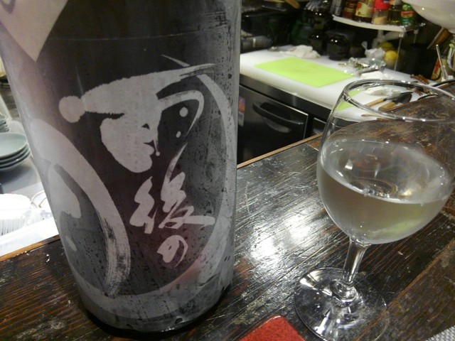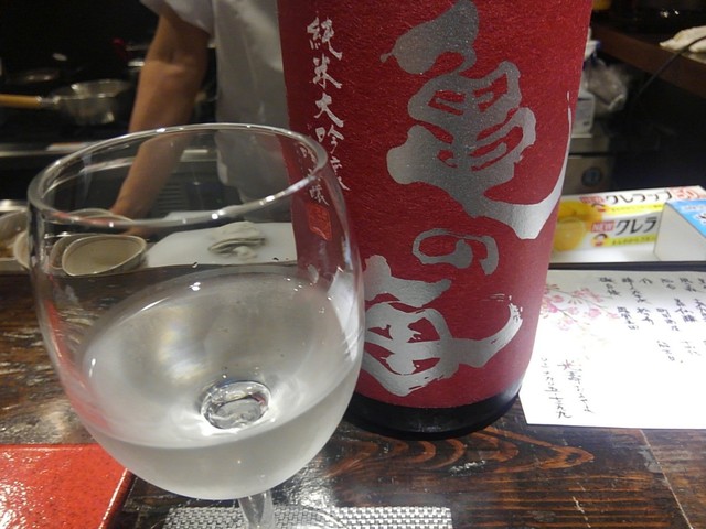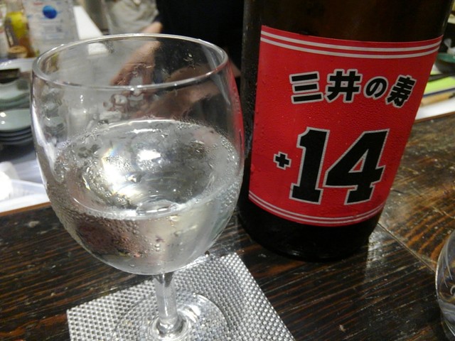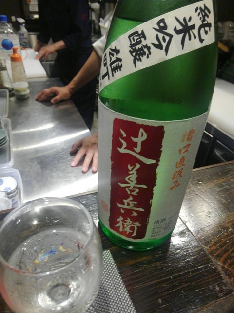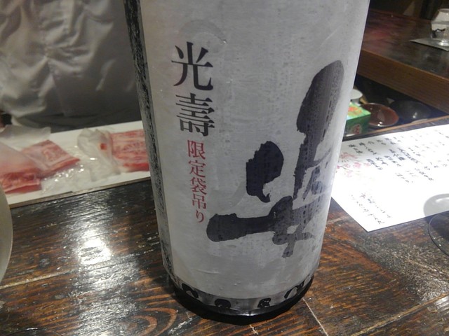 知人Bはマグロの熟成具合と、今年最後になるであろうホタルイカの旨味に痺れ上がっています。もともと焼酎がぶ飲み派の大呑兵衛であるBは、希少な酒には全く無感動(のフリw)でしたが、美味い摘みには過激に反応してくれました。特に牡蠣の味噌漬けの濃厚なこと。それに燻製の燻りがちょっと入っていて、ずっと食べていたいと宣っていました。そして、そんな日本酒音痴のBでしたが、その態度が崩れる瞬間が来ます。三井の寿(みいのことぶき)純米吟醸 大辛口 です。