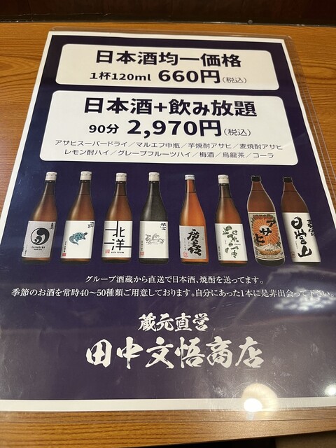 小さい声で言いますけど・・・採算度外視の銘柄も入っていたりするので、多少日本酒を知る方であれば冷蔵庫を漁るのが楽しみになりますね。最短90分2970円(税込み)の飲み放題はかなりお得だと思います。もちろん単品120mlで660円でも飲めますので、新規開拓もまた良しです。