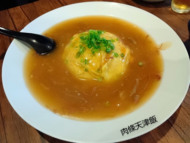 琥珀色した和風ダシの餡掛けの中に、筋繊維を解した牛すじがたっぷり。そしてふんわり玉子の天津飯。