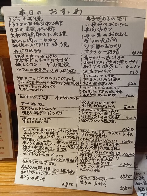 魚ばかりを記述したけど、大和肉鶏、和牛、鯨の料理もあったりするので、手書きぎゅうぎゅうのメニューを目を皿にして閲覧されますように。