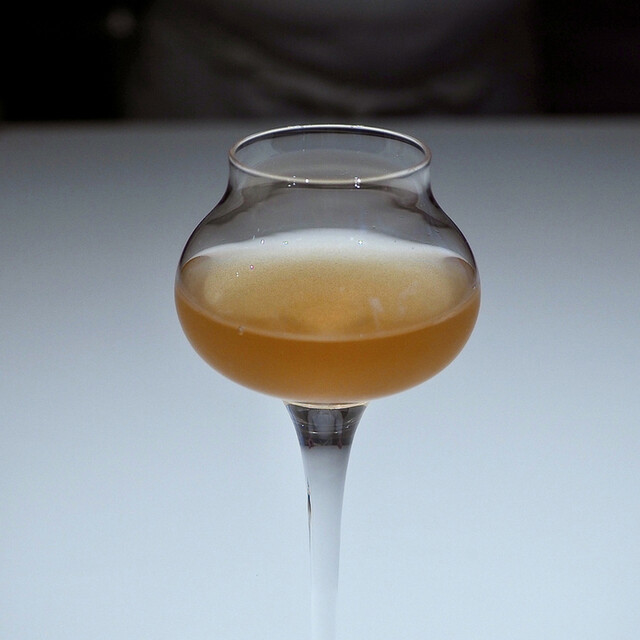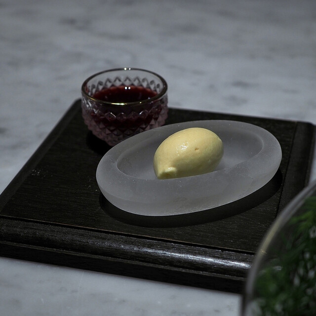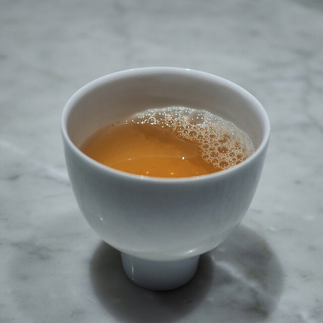 中は生の状態、表面のみ火を入れ、ジャスミンの香り付けをしたそう。ソースは桃をコンポートする時に使ったもの。