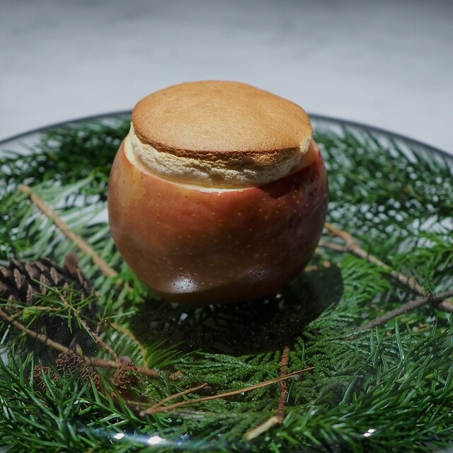 焼いてからメープルでマリネした無花果、シナモンカスタードと無花果の葉のソースと共に。