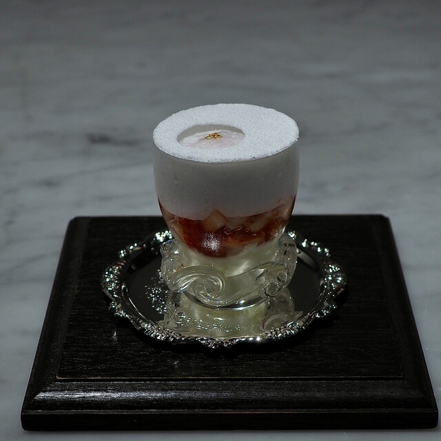 下にはゲイシャ種を使ったコーヒーソース、メレンゲ、青森産カシスのコンフィチュール、栗のペースト、タヒチ産バニラアイス、飴細工。