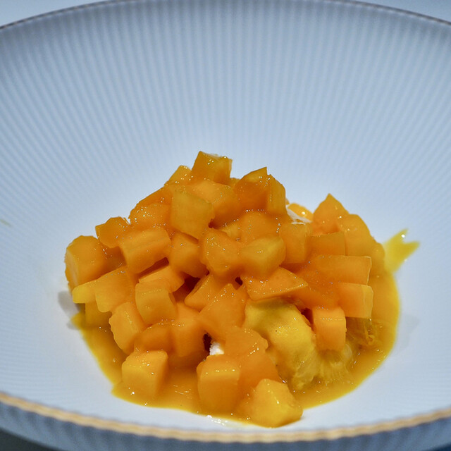 美しいお姿のモンターニュをスプーンで崩した後に、シェフがカットされたマンゴーを目の前でお皿にたっぷりかけてくれました。
