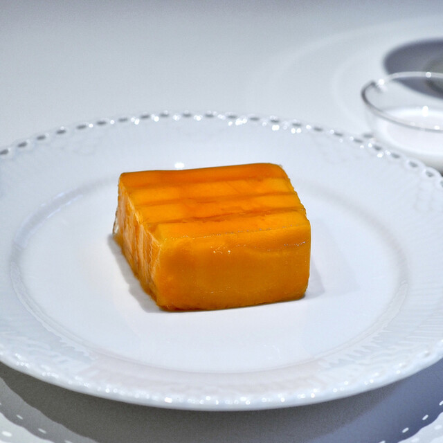 マンゴーとパイナップルと貴腐ワインのジュレ。ココナッツのソースをたっぷりかけて頂きました。