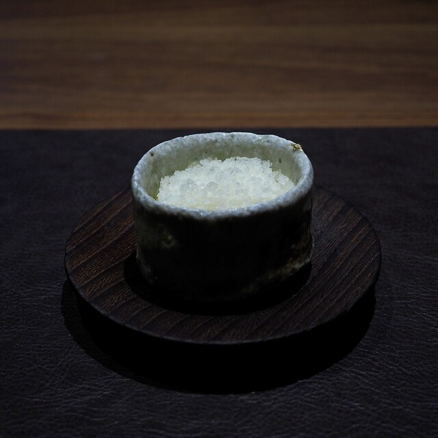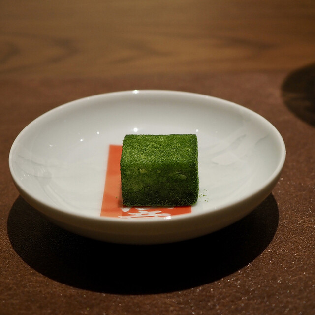 霜柱の上にうっすら積もった雪、寒い冬から春への期待を込めて作られたそう。かき氷のように見える薄くてサクサク食感の飴細工、蕗の薹のほろ苦さ、苺の酸味が一体となった繊細な一皿でした。