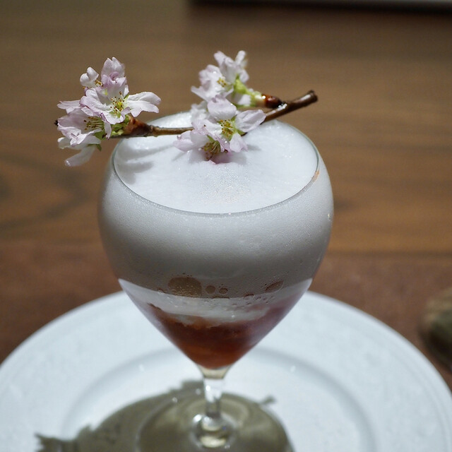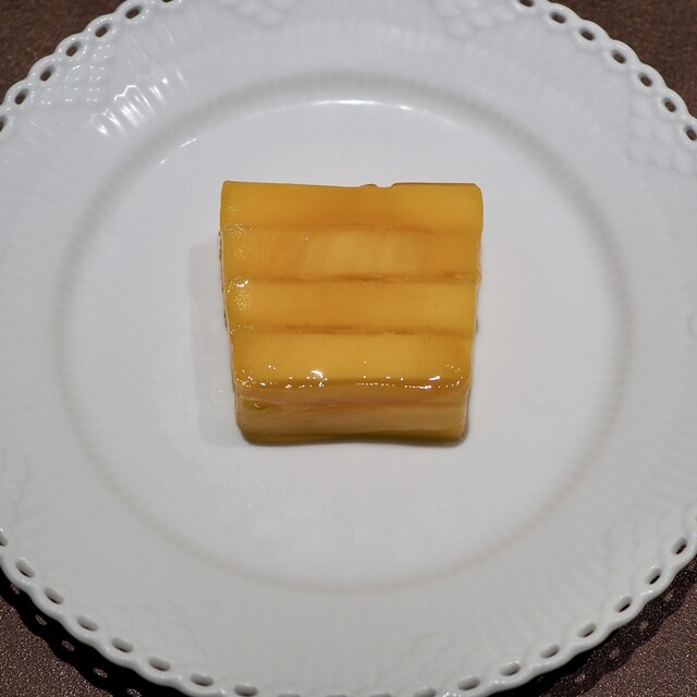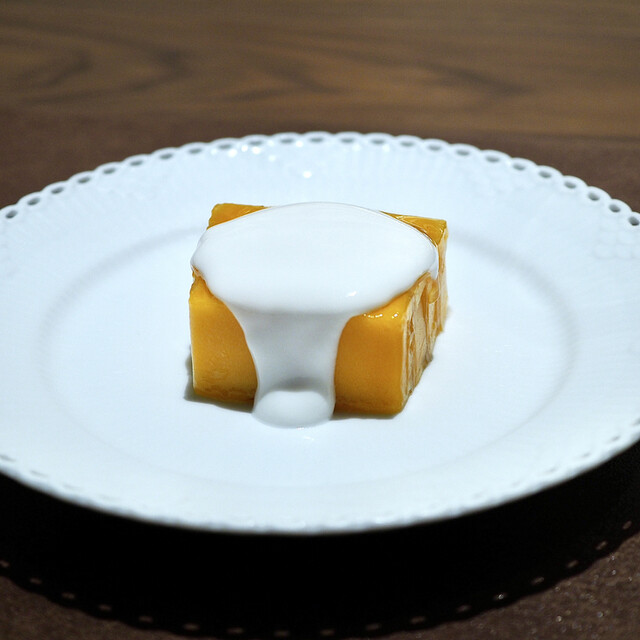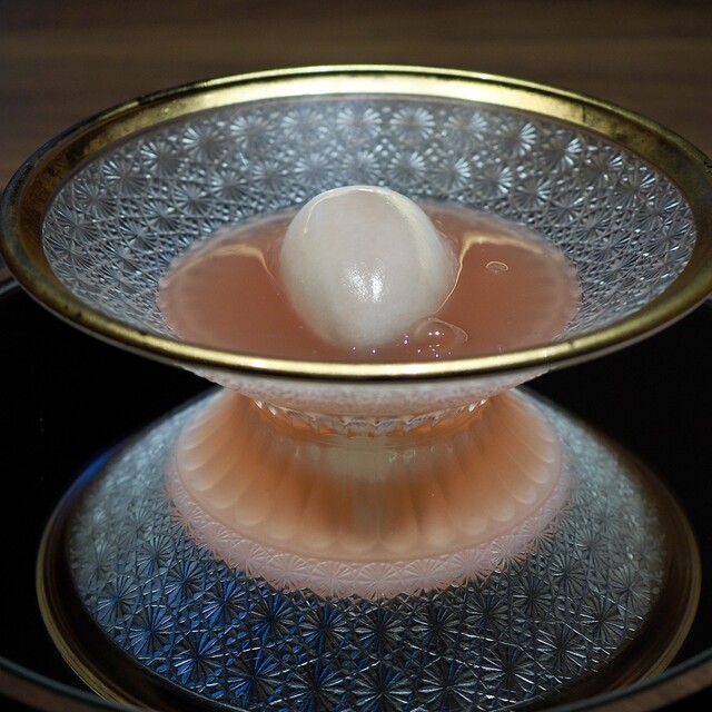シェフが中華料理からインスピレーションを受けて作られた一品だそう。アーモンドのブランマンジェ、ライチ、ジャスミンのジュレの上に桃をかけていただきました。ジャスミンジュレはジャスミンの花を使ったジュレなので、とっても香りがよく、桃やライチとの相性も抜群!お気に入りの一皿でした。