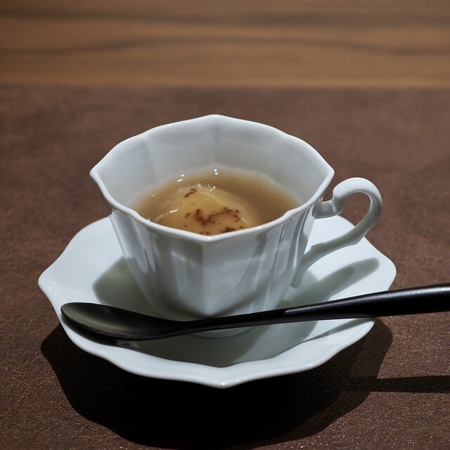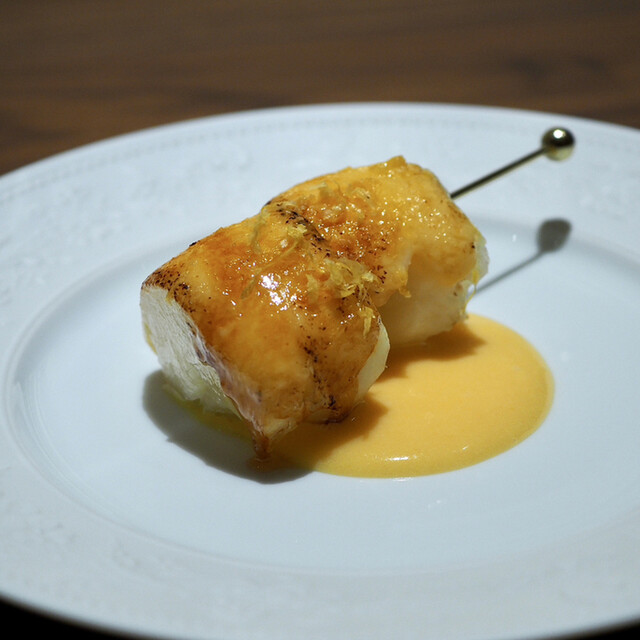 栗のフラン、お米のピューレ、裏漉しした栗。今年の絹はさらに磨きをかけたそうで、例年より白くて神々しささえ感じます!途中でトリュフソースをかけていただきました。このトリュフソースをかけると美味しさ倍増でした。