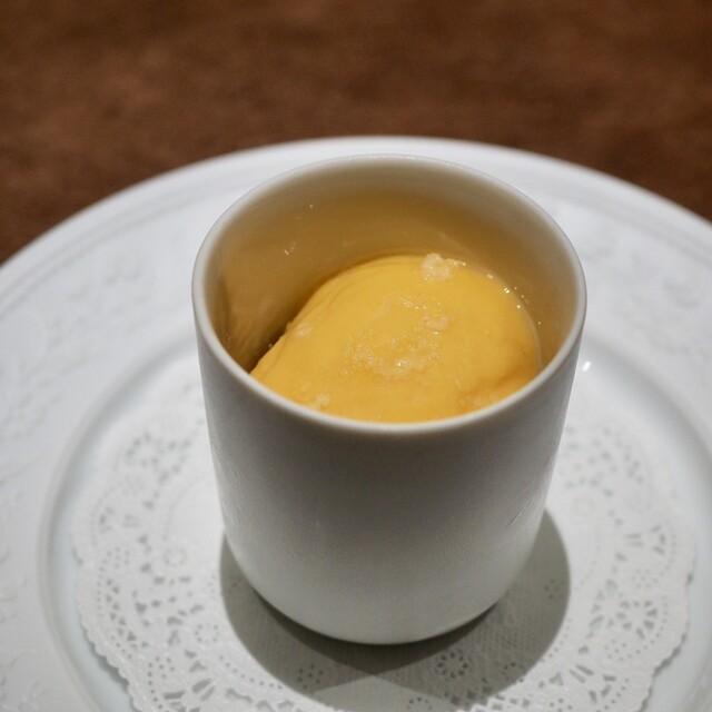 柚子、栗、洋梨を使用。ドーム状のメレンゲの中に柚子のクリーム、マロンクリーム、洋梨のソルベ。菊と柚子を使ったソース、洋梨のソースをかけて頂きました。