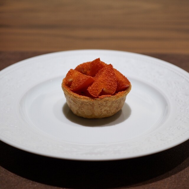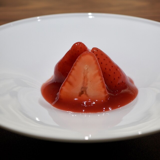 とちあいかと古都華を使用。苺の外側のみ火入れしており、中はフレッシュのまま。赤ワインのソースで。食感の違いを楽しめ、味の食べ比べができる一皿でした。