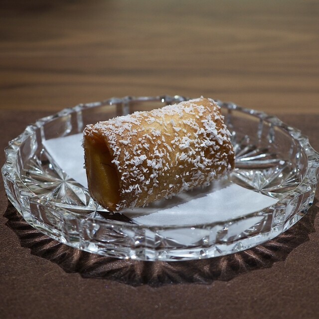 グリーンレモンシュガーをまぶした春巻き。中にはルレクチェが入っていました。