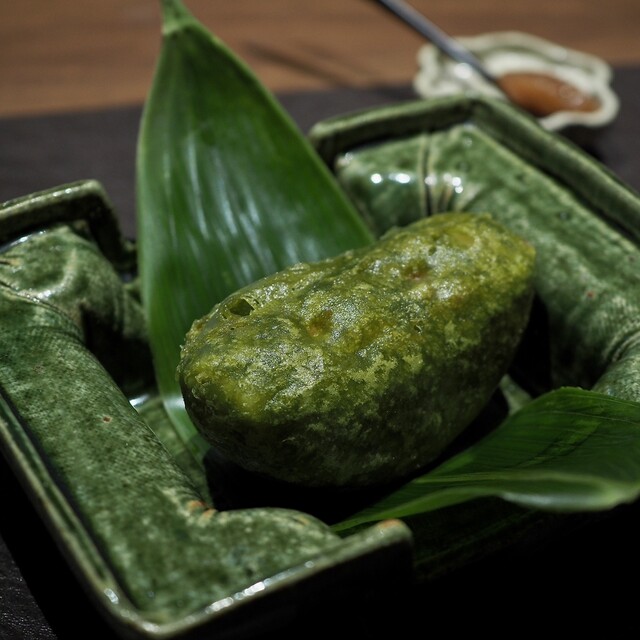 抹茶を練り込んだ衣で揚げた桃と梅干しのジャムをつけていただきました。