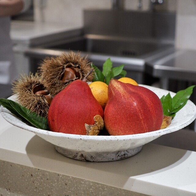 本日使用するフルーツは茨城産笠間栗(利平、つくば)、山形産洋梨(リーガルレッドコミス)、和歌山産ゆらわせみかん、岐阜産パプリカ