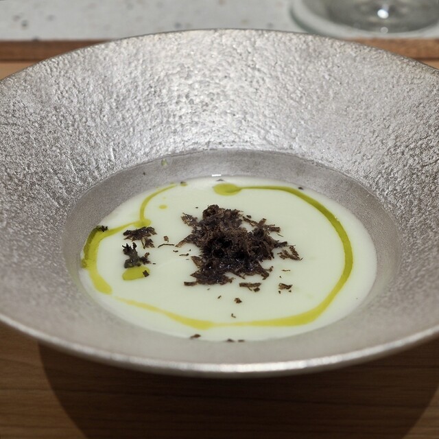 静岡県産新玉葱を使用。味付けは塩、オリーブオイル、バターのみなので玉葱本来の甘さや旨みがよく分かりました。上には黒トリュフがかかっており、最初はポタージュの美味しさを味わい、途中から黒トリュフを合わせて味の変化を楽しみました。