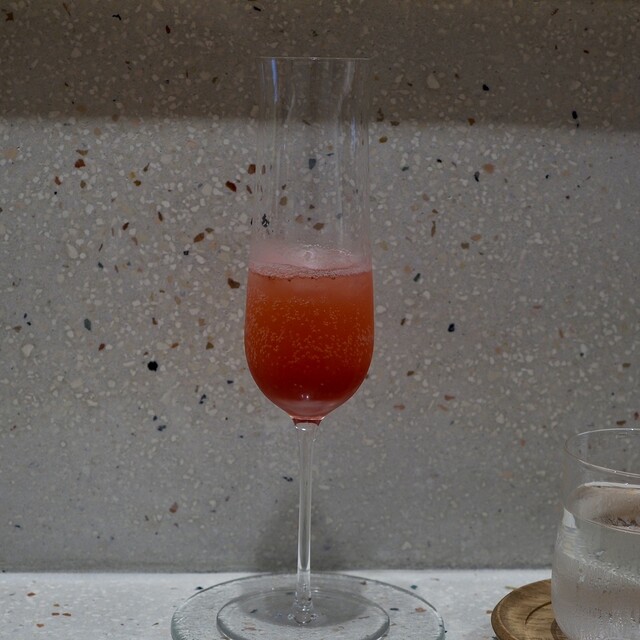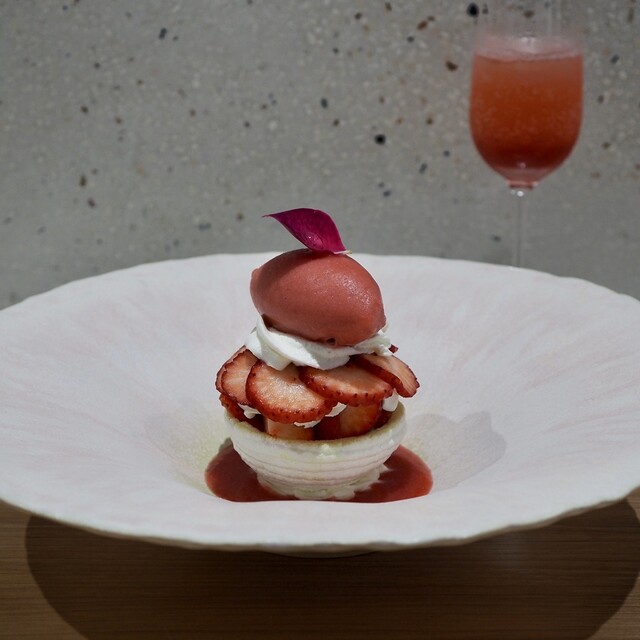苺とピスタチオの最強コンビにふんわり薔薇の香り、ペアリングにはあまりんのシロップソーダ割りと苺づくしの贅沢な一皿でした。
