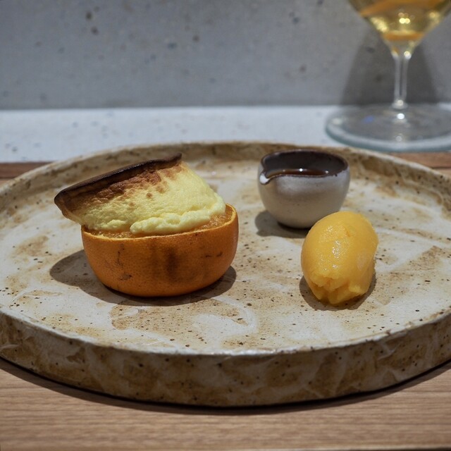 スフレ生地にもせとかの果汁が入っているスフレ、果肉と皮を使ったせとかのソルベ、せとかのスフレとほろ苦いキャラメルソースが相性抜群でした。