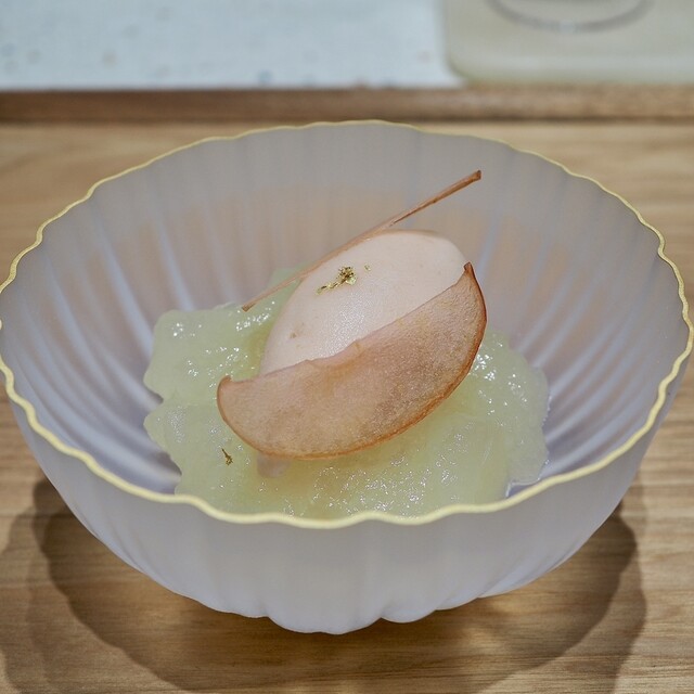 内容は生姜のパンナコッタ、フレッシュの洋梨、泡状の洋梨、洋梨のソルベ、すだちのジュレ、みかんの皮